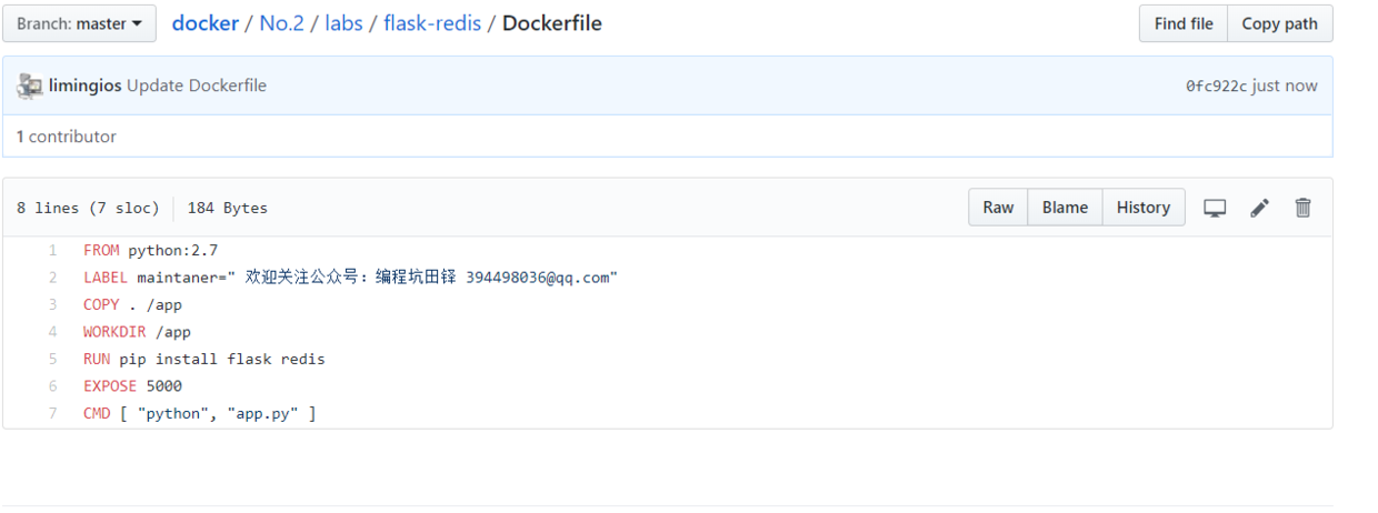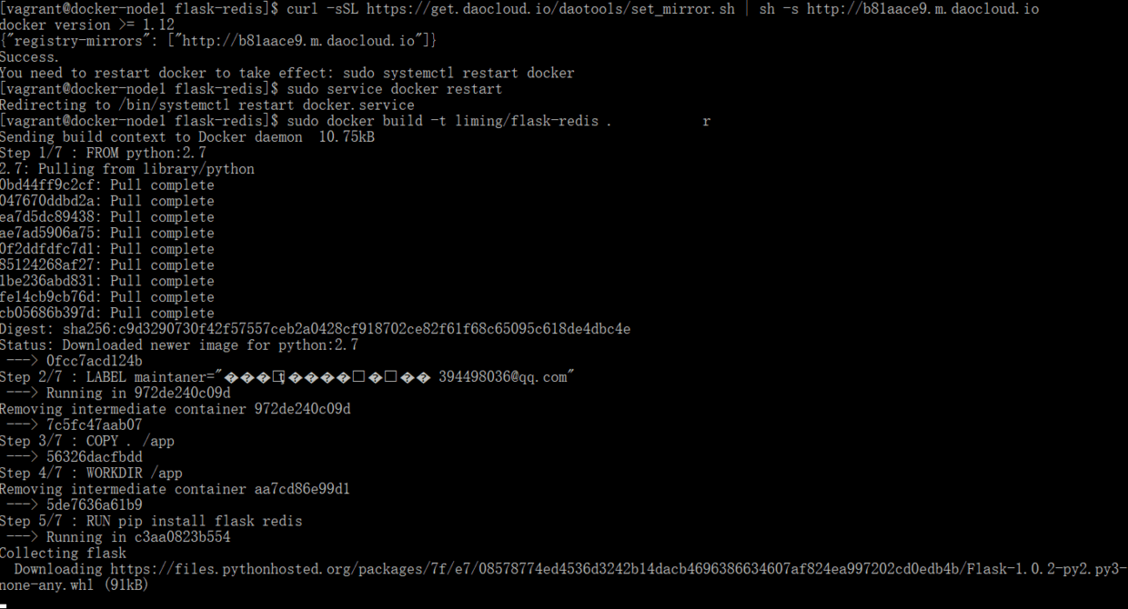 引用pyhon2.7的image,主机目录的app,拷贝到app目录下,运行pip按照python的插件,暴露5000端口,运行 python app.py