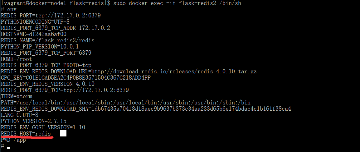 #通过-e 命令,把环境变量REDIS_HOST=redis 放入容器的环境变量中