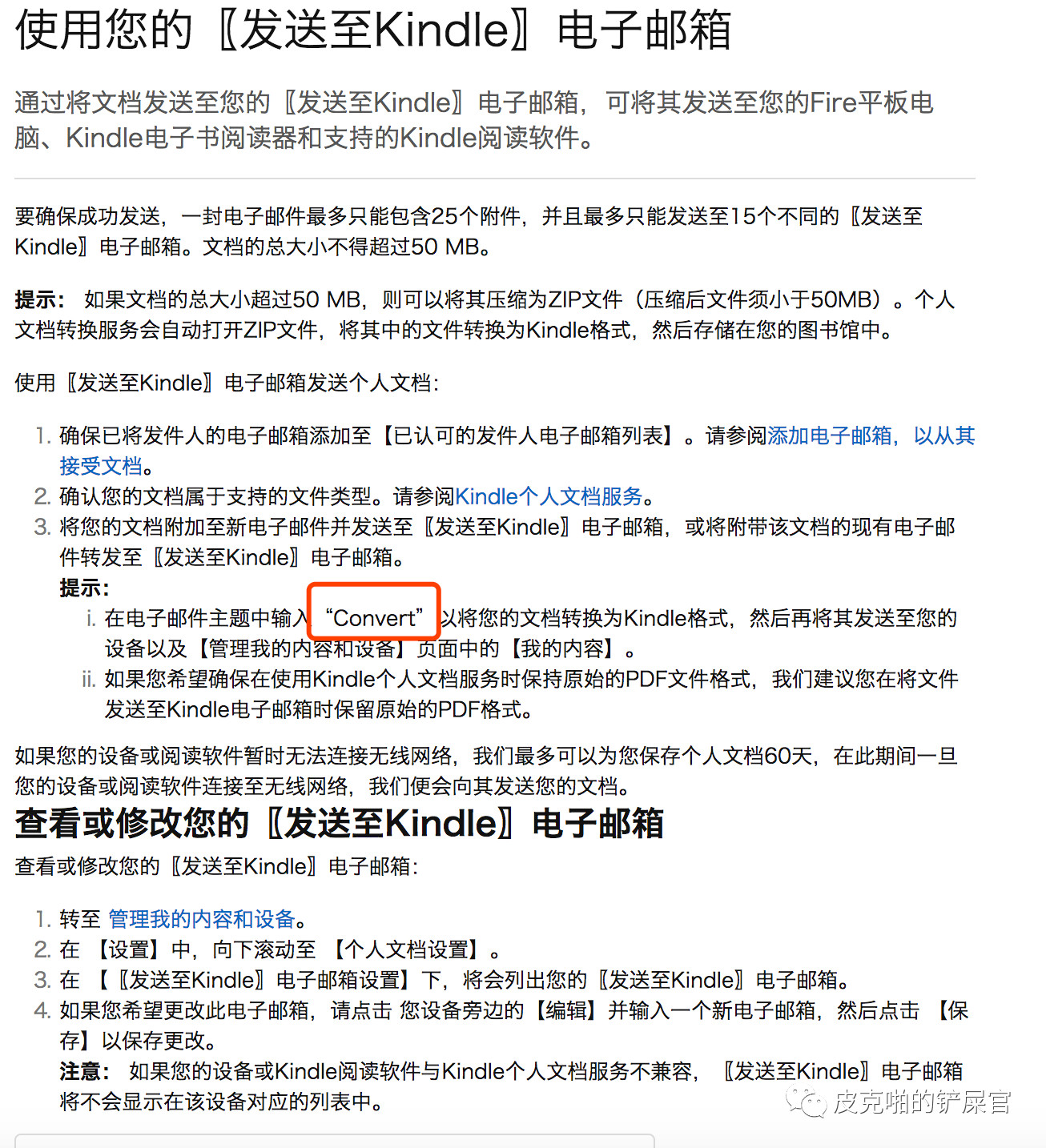这里需要通过Python来发送邮件。首先,我们得先了解一下如何通过发邮件的形式来把mobi文件发送到kindle上。这里,kindle的官方文档有很详细的说明: