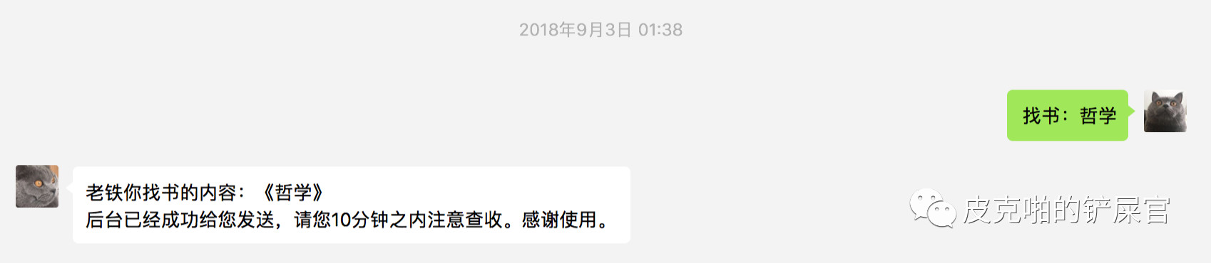 59 return "老铁你找书的内容:《" + book_name + "》\n后台已经成功给您发送,请您10分钟之内注意查收。感谢使用。"