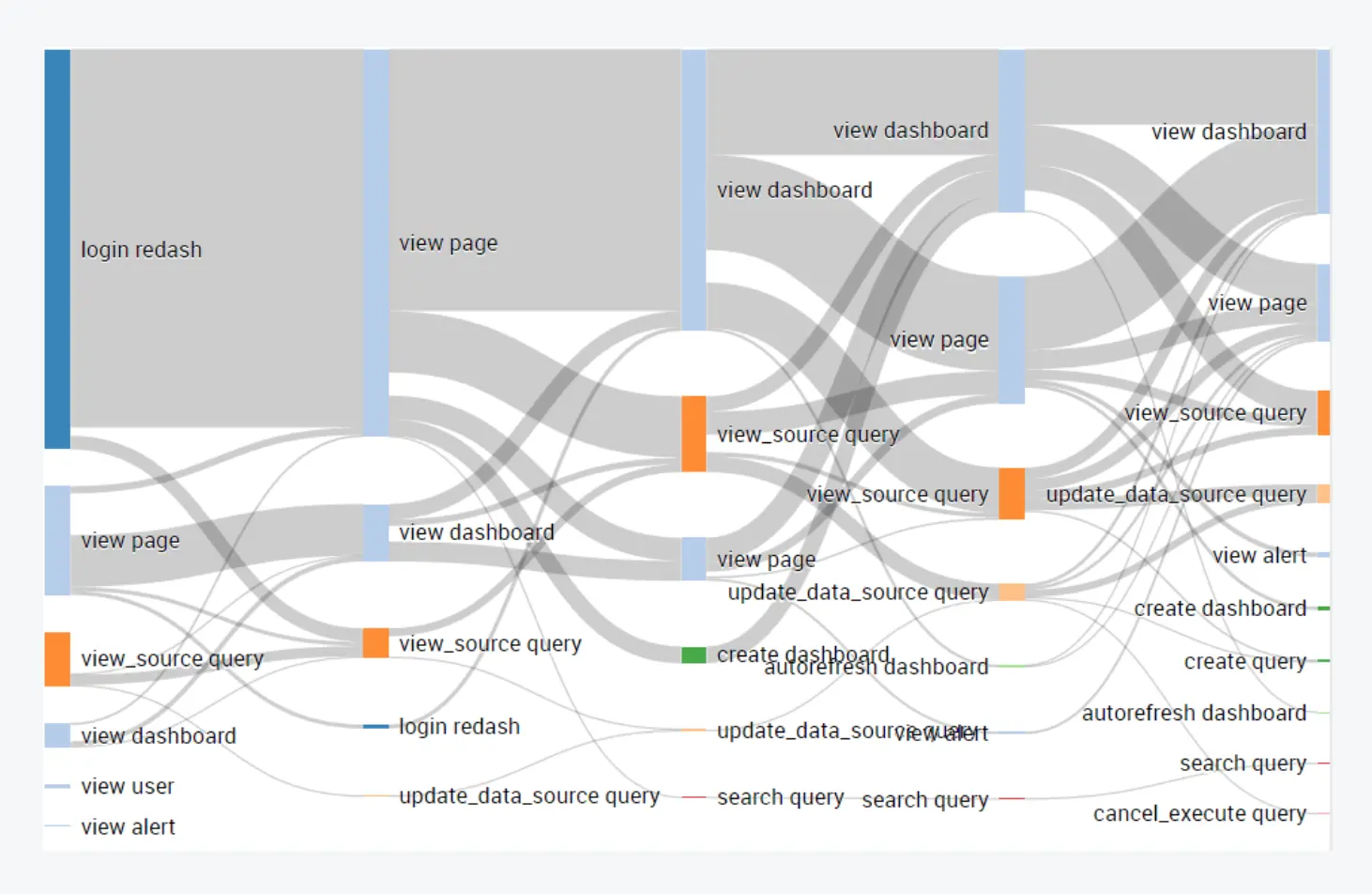桑基图用于表达流量分布于结构对比,最初的发明者使用它来呈现能量的流动与分布。