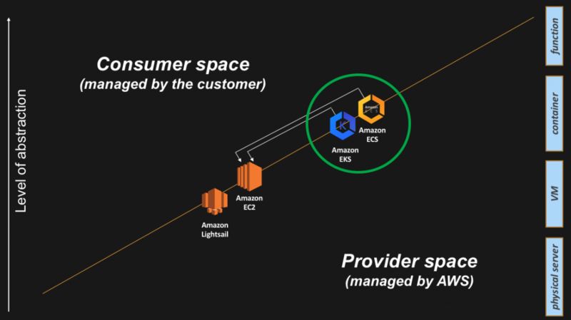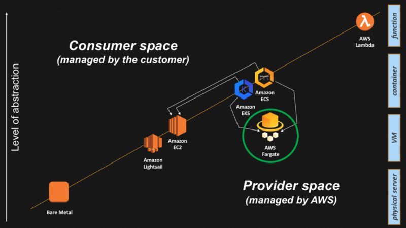 AWS Fargate 是一个生产级的服务,给 AWS 容器控制平面提供计算容量。实际上,Fargate 正在让容器数据平面落入“供应商空间”职责范围。这意味着公开给用户的计算单位是容器抽象,而 AWS 将透明地管理下面的数据平面抽象。