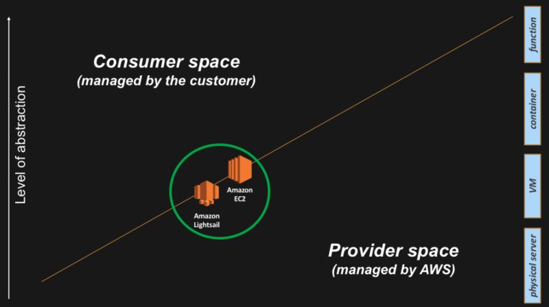 同一级别的还有 Amazon Lightsail,它是“开发人员、小企业、学生以及其他需要简单虚拟专有服务(virtual private server,简称 VPS)解决方案的用户开始使用 AWS 最简单的方法。Lightsail 为开发人员提供计算、存储、网络容量和功能以在云中部署、管理网站和网络应用程序”。