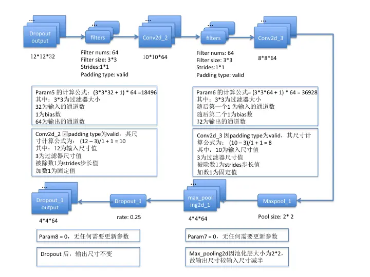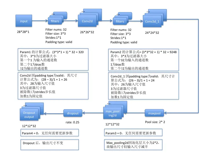 - 对于池化层、flatten、dropout操作而言,是不需要训练参数的,所以param为0;