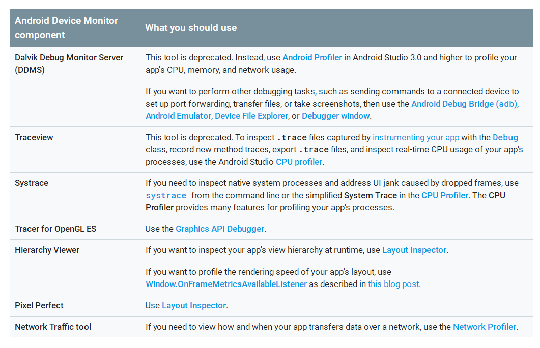 1.Android Studio 3.2之后,Android Device Monitor已经被移除.Android Device Monitor原先包含的工具由新的方案替代.Android Device Monitor