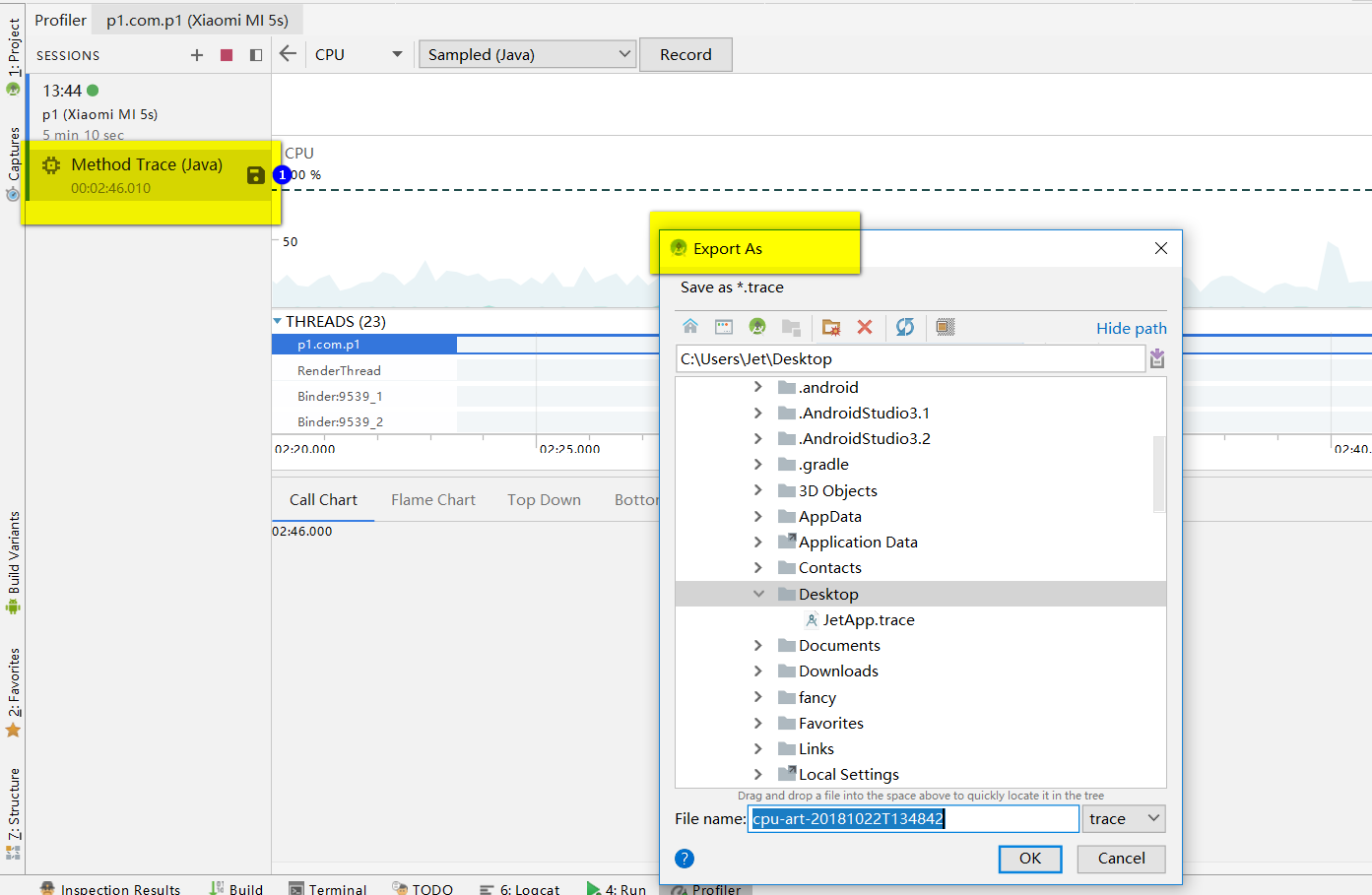 - TraceView可以直接通过CPU profiler中点击Record按钮后,任意时间后点击Stop按钮.即可生成trace文件.并可将.trace文件导出.