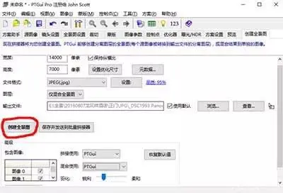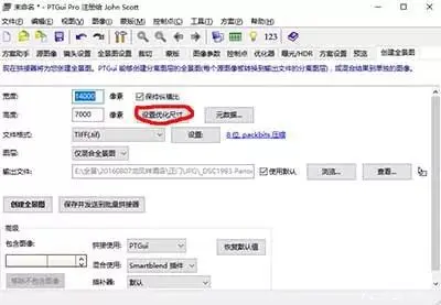 第四步:点选创建全景图片,点选设置优化尺寸(如果要上传至城市联盟VR全景制作平台,手动填写15000*7500以下分辨率,合成出的全景照片大小不会超过服务器100M限制)
