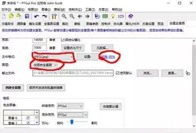 第五步:选择照片格式JPG, 品质95,仅混合全景图,点击创建全景图按钮,等待软件处理完毕后即可得到一张 二比一 15000*7500分辨率的全景照片,使用DevalVR播放器即可观看不同于平面照片的立体全景照片