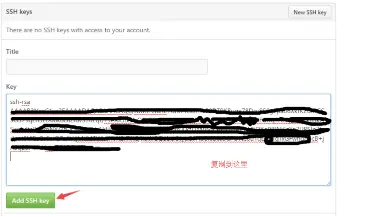 - 打开生成的id_rsa.pub文件,将里面的内容复制到ssh key 的key 输入框内,如下两图所示: