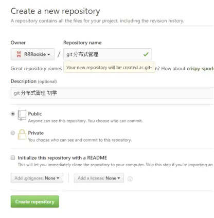 然后你的本地该位置就会创建一个代码库,而且告诉你是一个空的仓库(empty Git repository)。当前目录下多了一个.git的目录,这个目录是Git来跟踪管理版本库的,没事千万不要手动修改这个目录里面的文件,不然改乱了,就把Git仓库给破坏了。也不一定必须在空目录下创建Git仓库,选择一个已经有东西的目录也是可以的。如果你没有看到.git目录,那是因为这个目录默认是隐藏的,用ls -ah命令就可以看见。