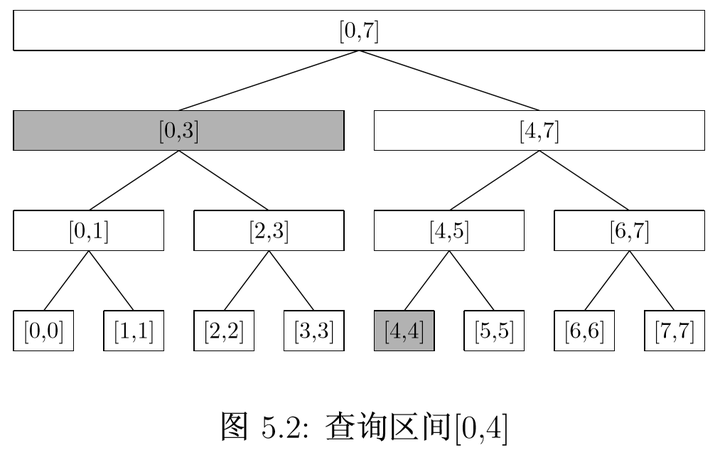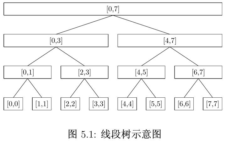 如图 5.1 所示,根结点代表区间 [0,7],而其左子结点,则代表区间 [0,3],右子结点代表区间[4,7]。这是一种把父结点所代表的区间直接二分的实现方法,虽然这种线段树最为常见,但两个子结点的区间长度实际上是可以随意变化的。这种变化的好处是树是高度平衡的,树的高度为 log(n),这就意味着从根结点到任意叶子结点的路径长度就是 log(n)。