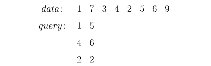 这样的数据结构有什么好处呢?我们来看这样一道题目。给定包含 N 个数的数组 data[N] 和 Q 个查询。每个查询的输入 (a, b) 都是一对整数,要求打印出 data[a] 到 data[b] 之间的最大值和最小值之差。例如,N = 6,Q = 3,一个输入样例是