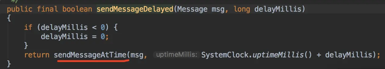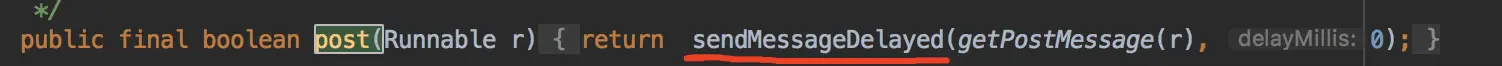 这里就不一一列举了。我们在开发中常用的延时操作往往借助上面 handler.xxxDelayed方法来轻松实现。 其实使用上述不管哪种方法都调用了sendMessageDelayed函数,所以实质都是一致的。我们随便拿一个看看其内部实现(如:post(Runnable) ):