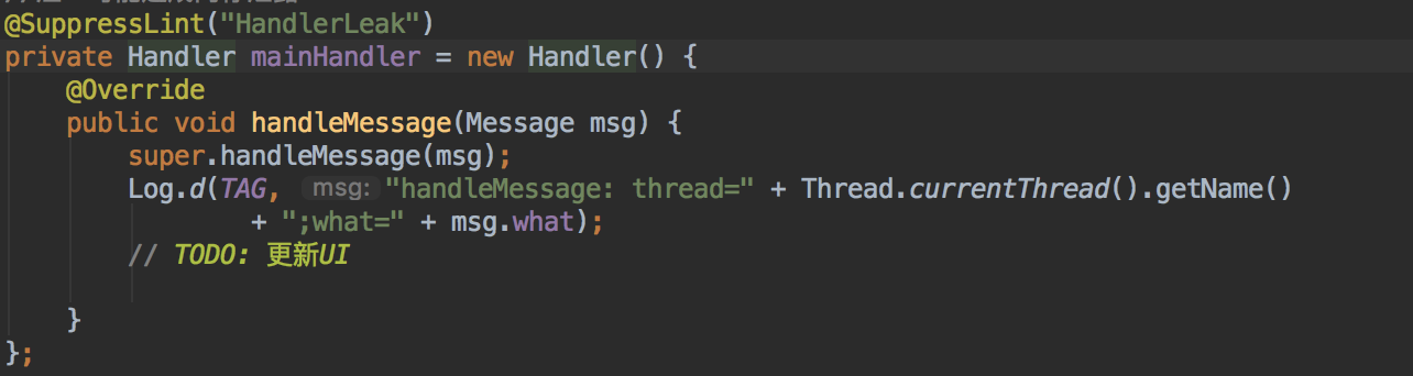 根据上面打印日志可以看出handlerMessage运行在main线程,故可以在这里更新ui。而且发送的what成功正确接收到为1000.