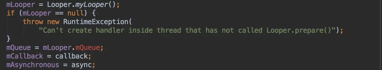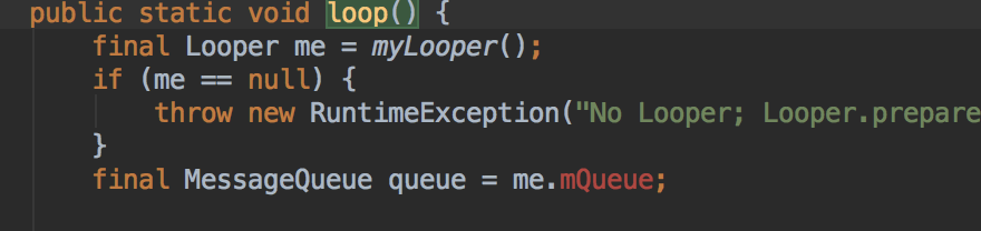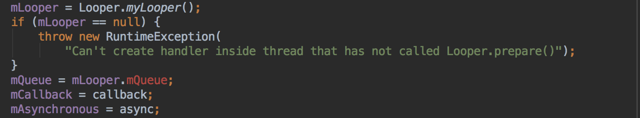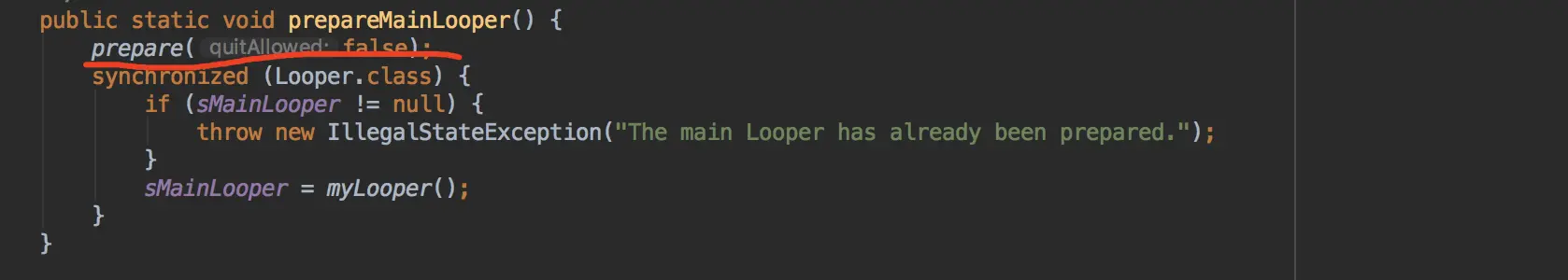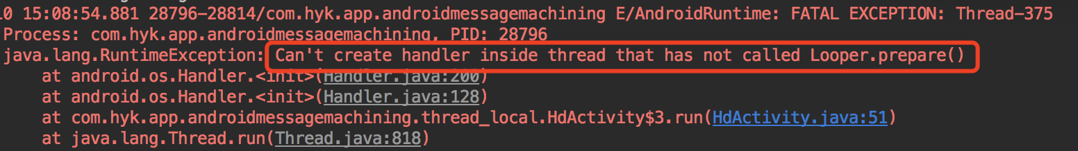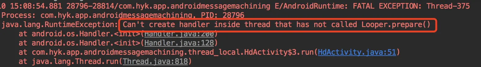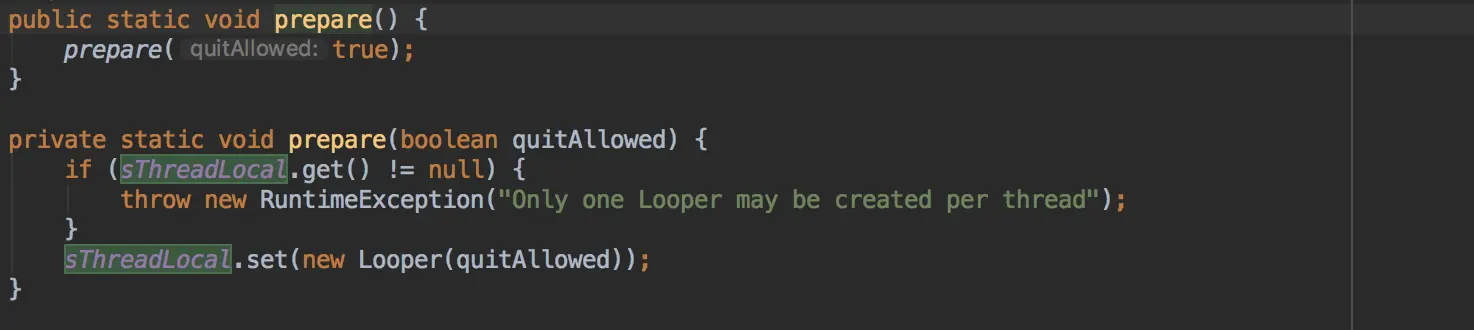 现在我们清楚了ThreadLocal的作用,继续回到上面对Looper的分析。因sThreadLocal.get()返回null,导致异常发生。根据错误日志,需要先调用 Looper.prepare()方法才行。那我们可以推测,prepare()方法里面应该做了sThreadLocal.set(looper)操作。