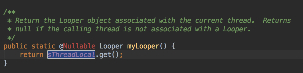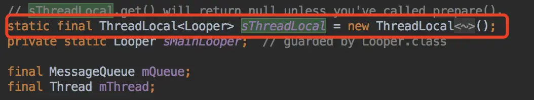 sThreadLocal.get()返回一个空对象。那sThreadLocal又是什么?在Looper类源码中可以看到: