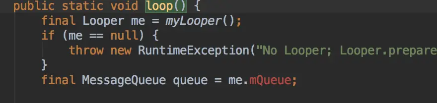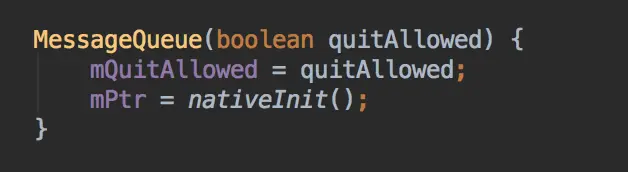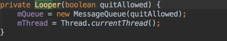 也就是说我们创建一个Looper对象,MessageQueue (按字面意思理解:消息队列)就被创建了。也可以发现,默认情况下,这个MessageQueue的quiteAllow=true。