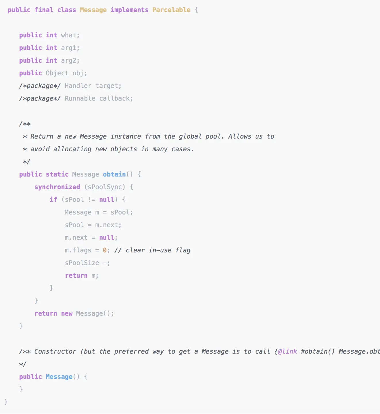 推荐使用obtain(),该方法可以从消息池中获取Message实例,不推荐直接调用构造方法。