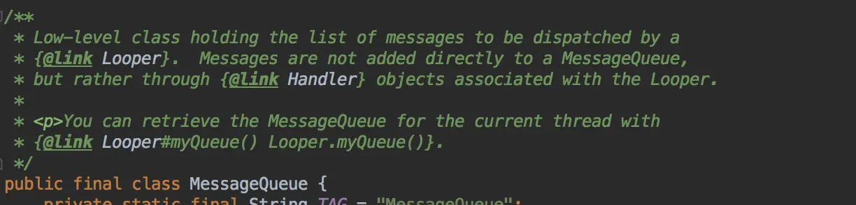 nativeInit()方法实现为android_os_MessageQueue_nativeInit();这是一个底部方法在此不做细究。有兴趣的自行深入分析。如果只想要了解MessageQueue的作用我们换种方式直接看看其注释,便会一目了然: