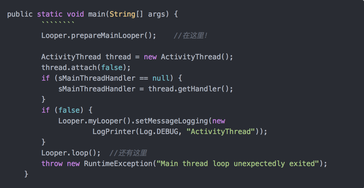 我们找到android应用程序的入口ActivityThread中的main方法。ActivityThread就是应用程序的主线程,打开它的main方法可以看到:
