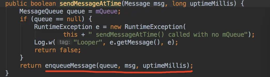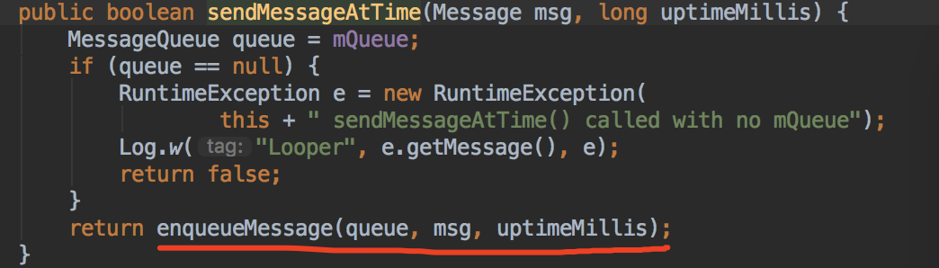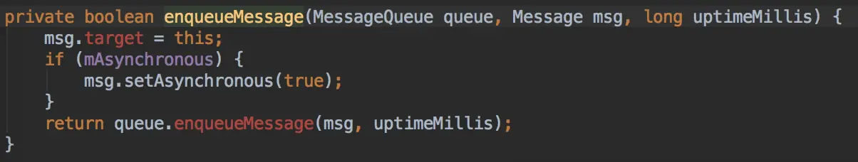 我们可以看到最后执行的是MessageQueue的enqueueMessage方法,前面在介绍MessageQueue的时候我们就知道了这个enqueueMessage方法是用于"入队"操作的。看看源码也就清楚: