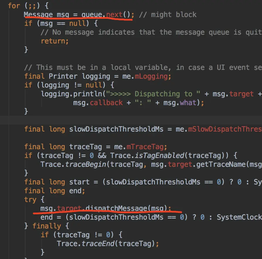 回到loop()方法片段2,我们得到了Message对象,继续向下走到第二处红线位置,也就到了分发处理Message的时候了。
