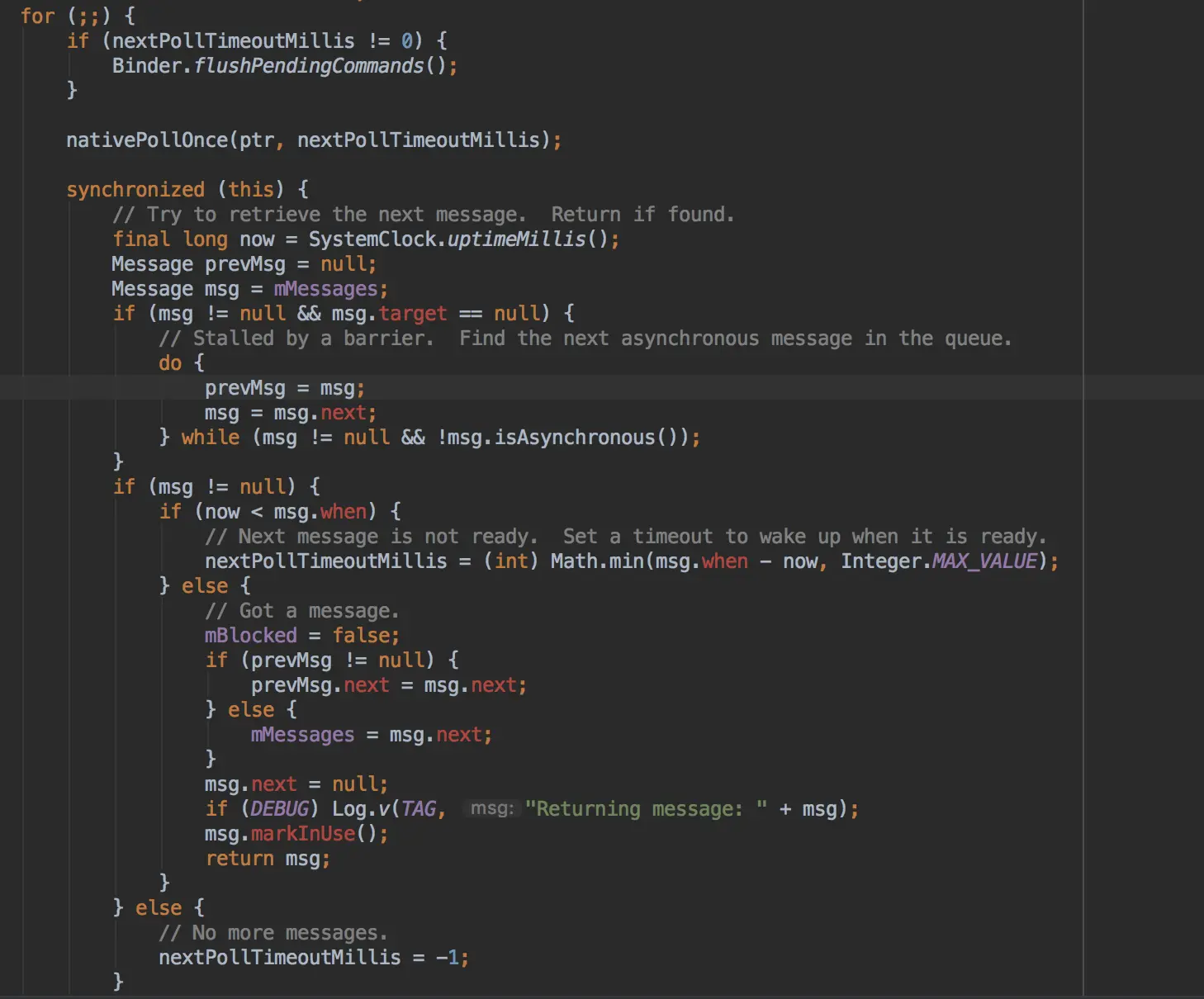 简单分析一下,if(now < msg.when) 若当前时间还没到msg指定时间,设置一个timeout以到时用于唤醒;else msg执行出队操作。另外可以发现当msg=null,当也即消息队列为空,nextPollTimeoutMillis置为 -1 ,next就会阻塞。