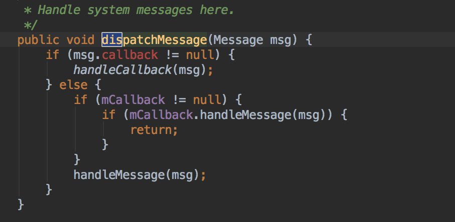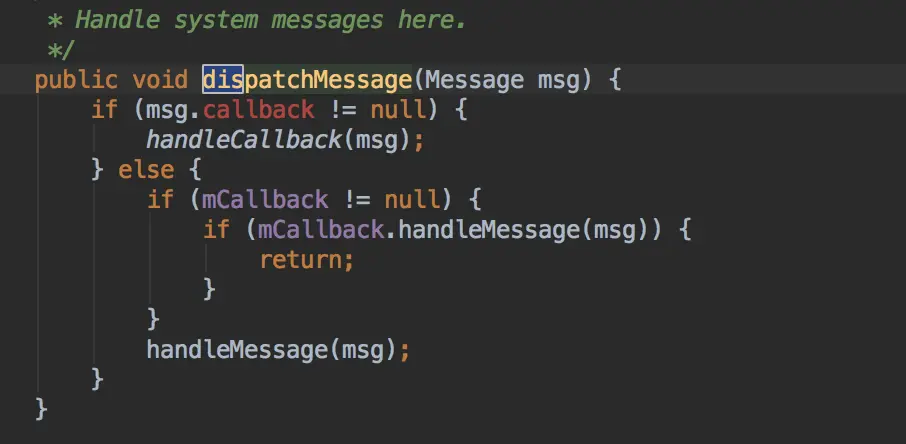 记不记得我们分析发送消息时提到的一个"特别注意"事项(msg.target = this 这句代码,该message的target赋值为当前的handler对象),在这里果然用到了。也就是说Handler发送的每个Message对象都存在有该Handler的句柄(target),所以这里实质就是调用了handler的dispatchMessage方法,那我们进入Handler.dispatch方法:
