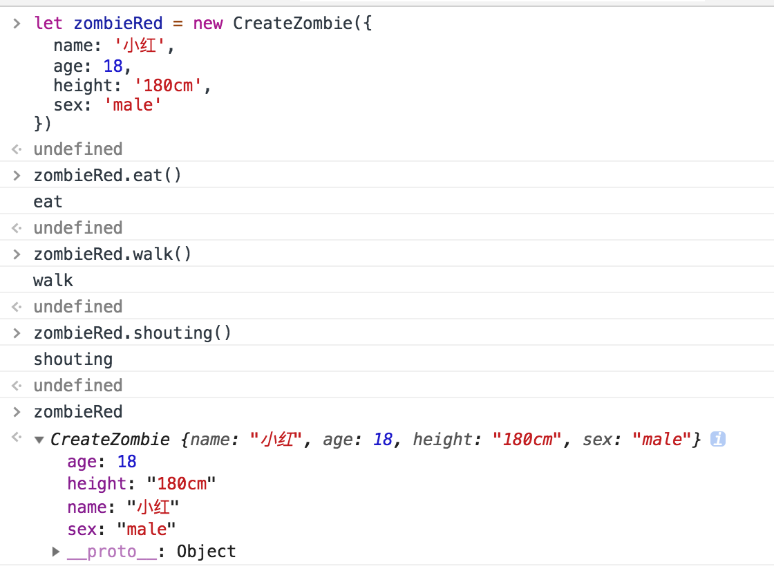 可以看到zombieRed中并没有eat等方法,它却可以使用。这就是通过原型机制实现的。