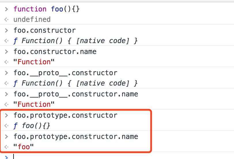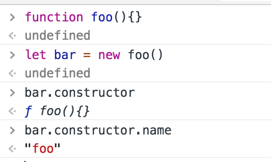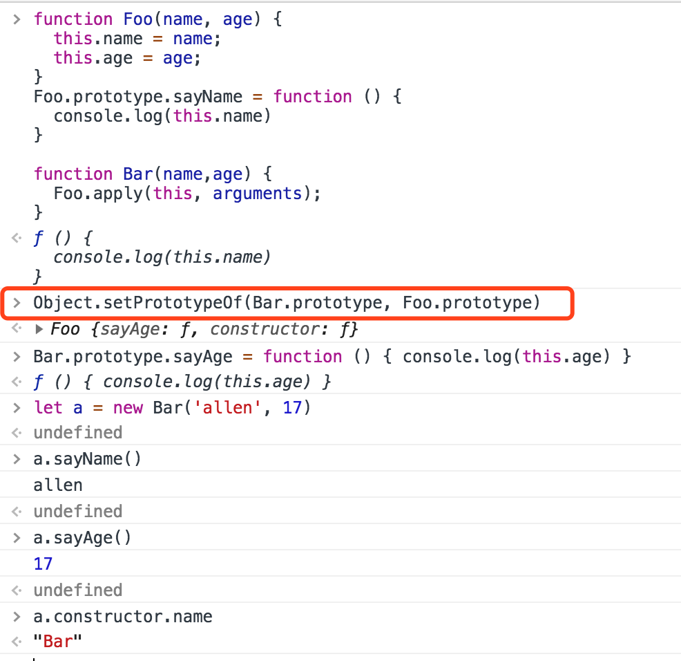 function Foo(name, age) { this.name = name; this.age = age; } Foo.prototype.sayName = function () { console.log(this.name) } function Bar(name,age) { Foo.apply(this, arguments); } Bar.prototype = Object.create(Foo.prototype) Bar.prototype.sayAge = function() { console.log(this.age) } let a = new Bar('allen', 17); a.sayName(); // 'allen' a.sayAge(); // 17 a.constructor.name; // Foo上面例子中是存在一个问题的,之前介绍过一个属性constructor,函数中的prototype属性中的constructor属性,默认指向自己,这个属性会被它创建的对象继承过去,当这句代码