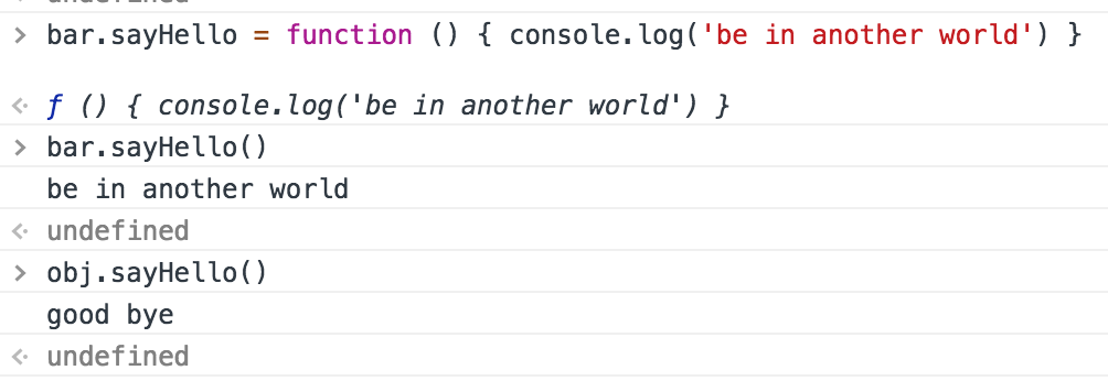 bar.sayHello = function () { console.log('be in another world') } bar.sayHello(); // be in another world obj.sayHello(); // good bye