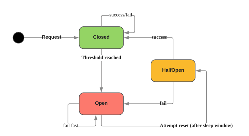 关闭:让请求通过的默认状态。如果请求成功/失败但低于阈值,则状态保持不变。可能出现的错误是超过最大并发数和超时错误。