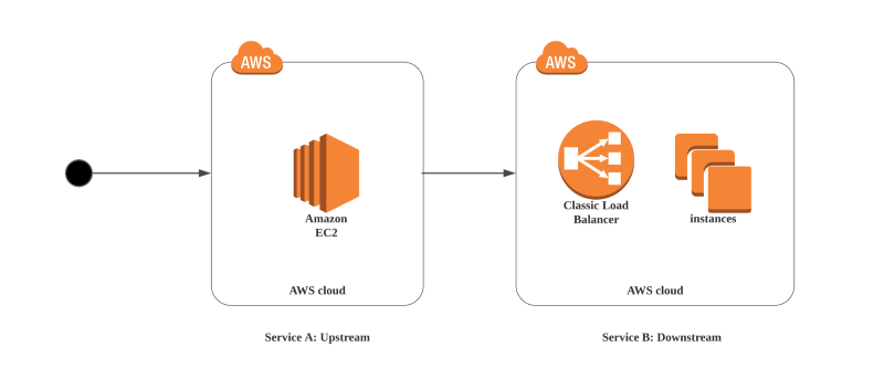 设想一个简单的场景,其中用户的请求调用服务A,随后调用另一个服务。我们可以把B称作A的下游服务。服务B前面有负载均衡器。