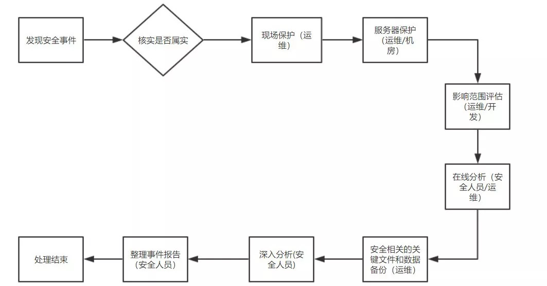 下面是一个通用的安全事件应急响应流程,很显然运维人员、安全人员需要配合很多工作,其中需要注意的有: