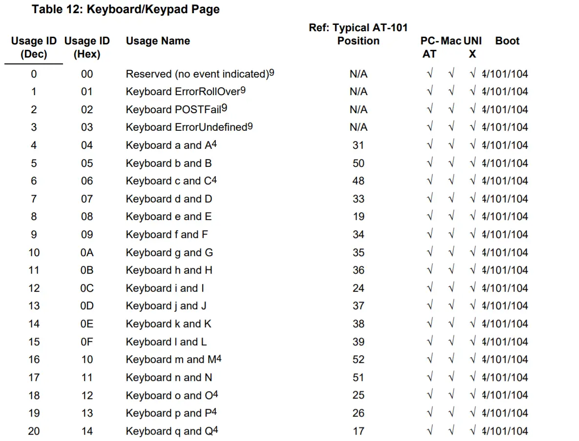 我翻阅了大量的USB协议的文档,在这里我们可以找到这个值与具体键位的对应关系:www.usb.org/developers/…