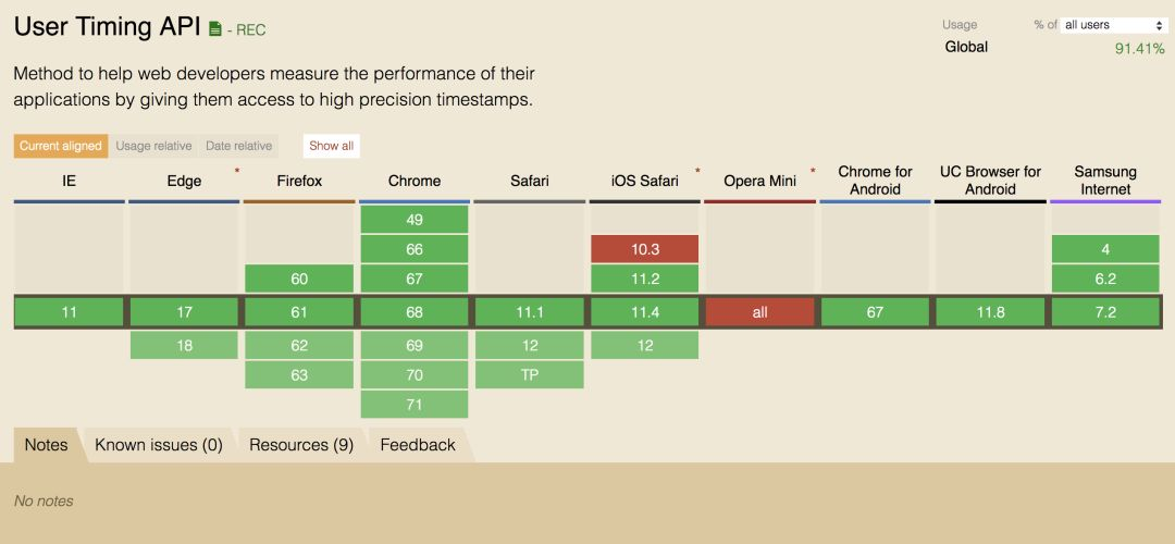 图为 User Timing 的支持情况: