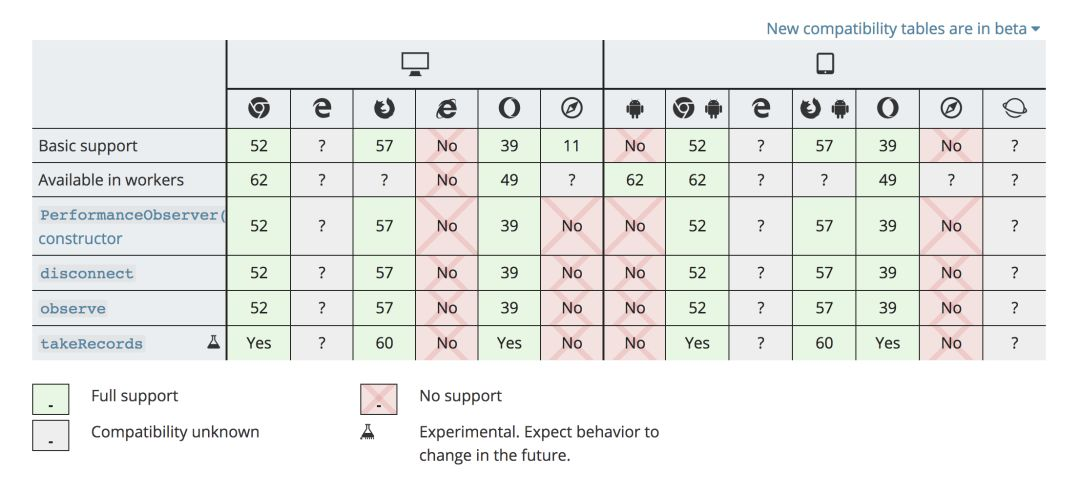 图为 Performance Timeline Level 2 中 PerformanceObserver API 的支持情况: