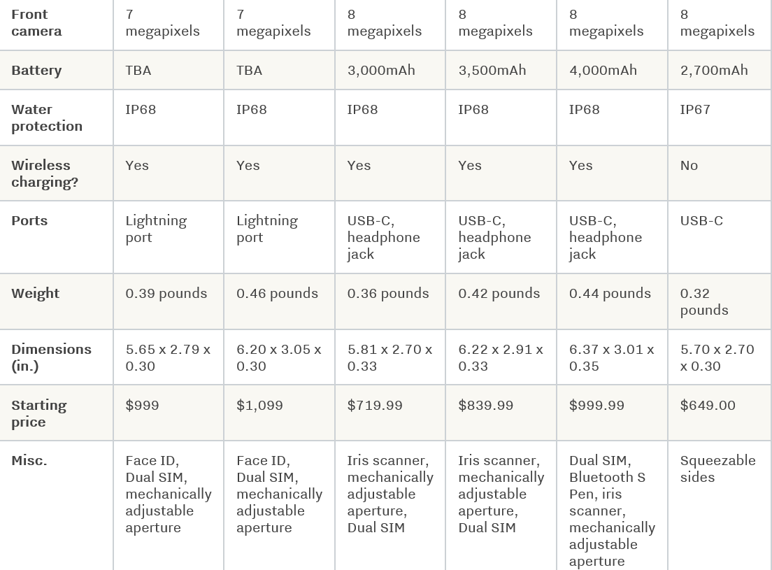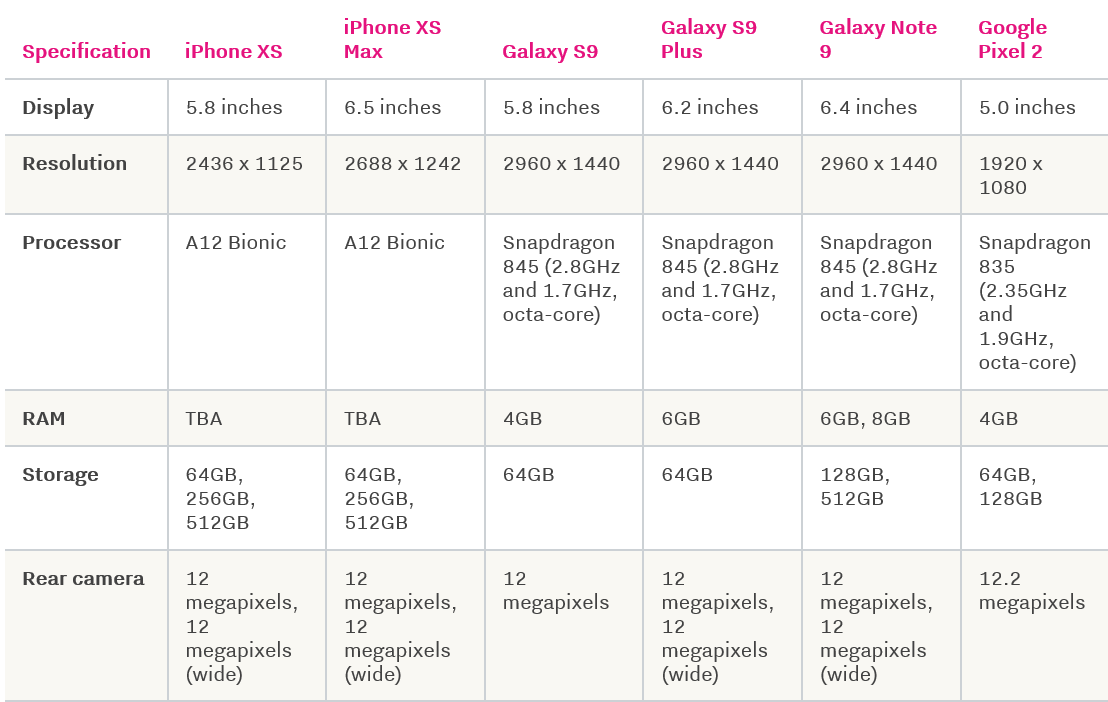 The Verge还直接po出一个表格将苹果新机规格同现有的安卓手机进行比较,抛出这样一个问题:新款iPhone如何与顶级安卓手机相抗衡?