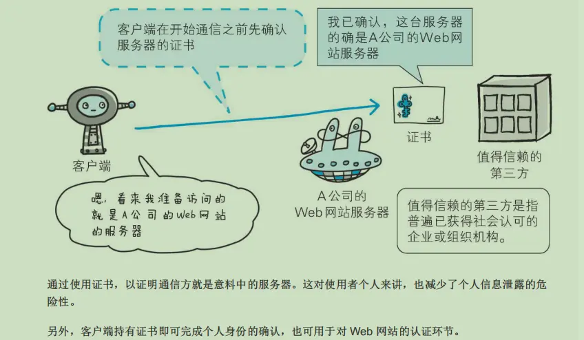 虽然使用 HTTP 协议无法确定通信方,但如果使用 SSL 则可以。SSL 不仅提供加密处理,而且还使用 了一种被称为证书的手段,