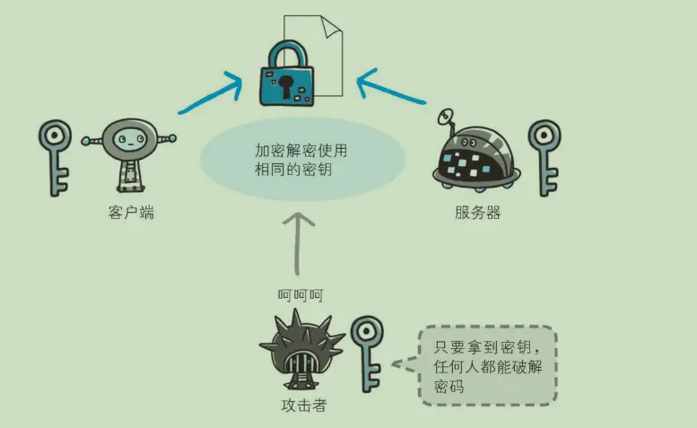 加密和解密都会用到密钥。没有密钥就无法对密码解密,反过来说,任何人只要持有密钥就能解密了。如果 密钥被攻击者获得,那加密也就失去了意义。