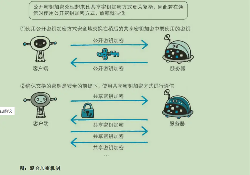 HTTPS 采用共享密钥加密和公开密钥加密两者并用的混合加密机制。若密钥能够实现安全交换,那么有 可能会考虑仅使用公开密钥加密来通信。但是公开密钥加密与共享密钥加密相比,其处理速度要慢。 所以应充分利用两者各自的优势,将多种方法组合起来用于通信。在交换密钥环节使用公开密钥加密方 式,之后的建立通信交换报文阶段则使用共享密钥加密方式。