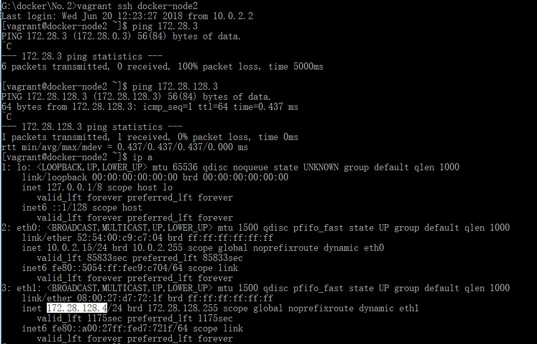 #docker-node1 里面ping 172.28.128.4 直接访问node2