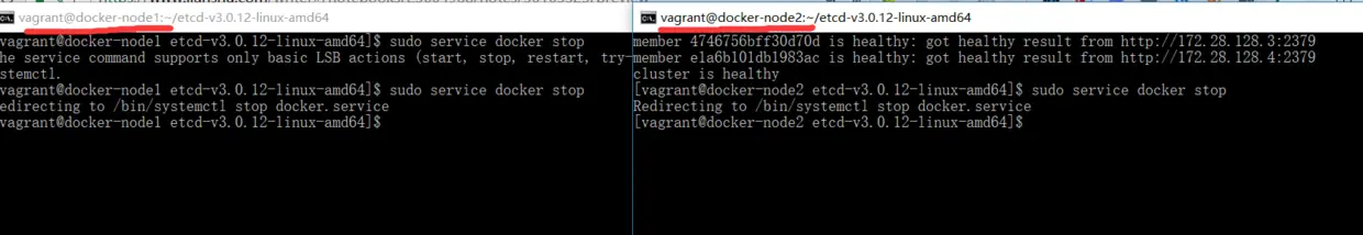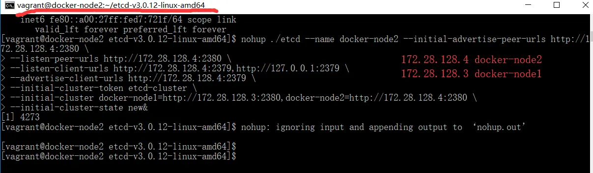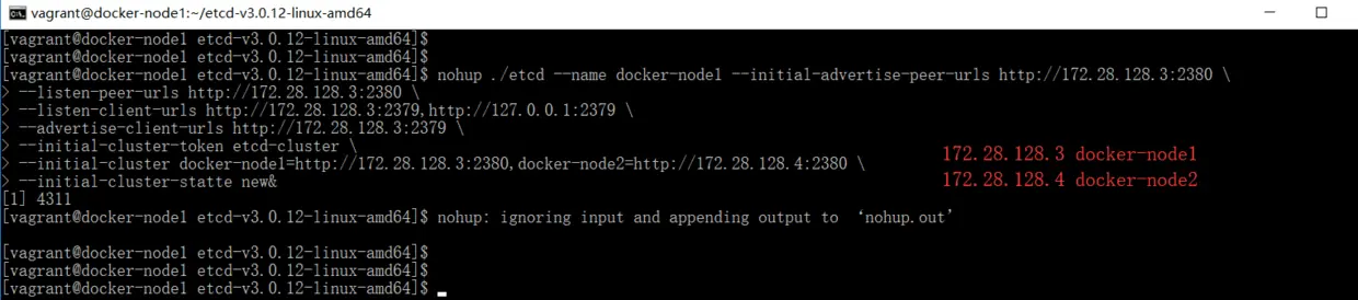 --initial-cluster docker-node1=http://172.28.128.3:2380,docker-node2=http://172.28.128.4:2380 \