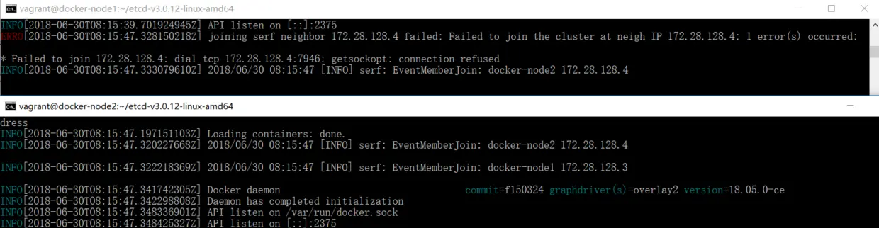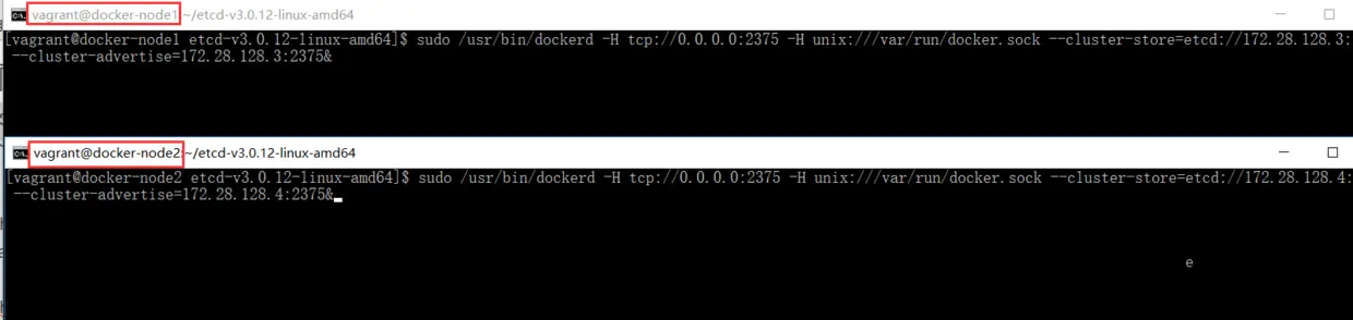 sudo /usr/bin/dockerd -H tcp://0.0.0.0:2375 -H unix:///var/run/docker.sock --cluster-store=etcd://172.28.128.3:2379 --cluster-advertise=172.28.128.3:2375&