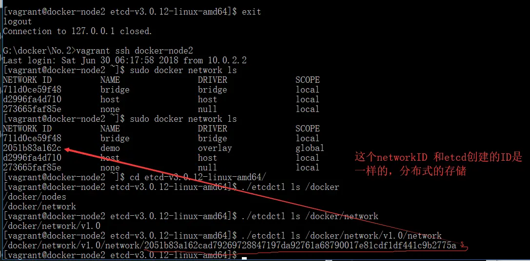 #docker-node1创建了overlay网络后,node2也创建了。这是为什么呢?其实这就是etcd帮咱们做的。