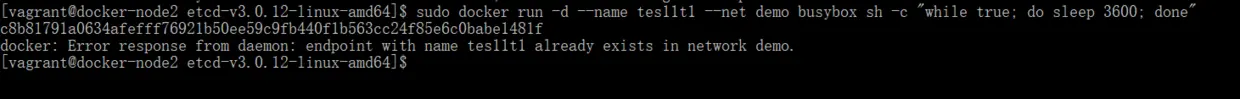 #说有相同容器已经存在了,不允许创建。如果在同一台docker机器上不允许名称一样的,说明这2个docker-node1 和docker-node2 已经在同一个网络空间内了