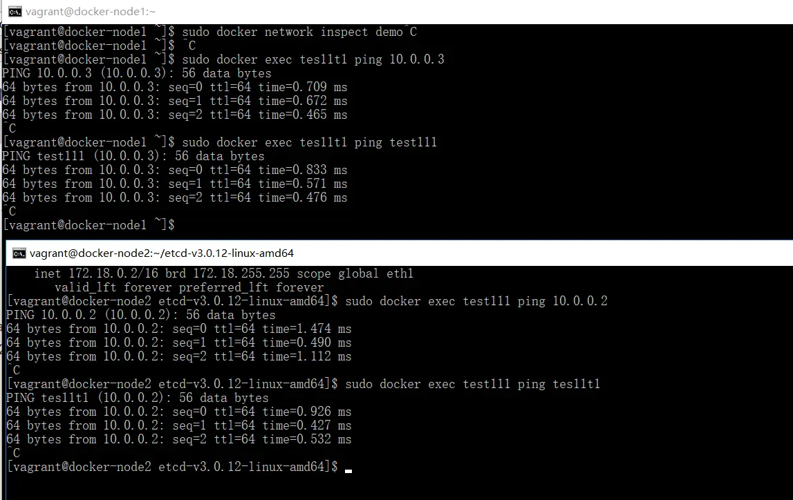 之前建立的docker-node1 和docker-node2 现在启动他们 看看他们之前是否可以ping通