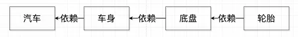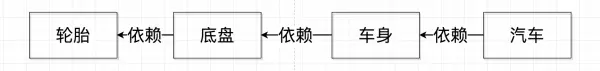 假设我们设计一辆汽车:先设计轮子,然后根据轮子大小设计底盘,接着根据底盘设计车身,最后根据车身设计好整个汽车。这里就出现了一个“依赖”关系:汽车依赖车身,车身依赖底盘,底盘依赖轮子。