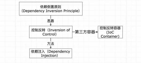 就是依赖倒置原则的一种代码设计的思路。具体采用的方法就是所谓的依赖注入(Dependency Injection)。其实这些概念初次接触都会感到云里雾里的。说穿了,这几种概念的关系大概如下: