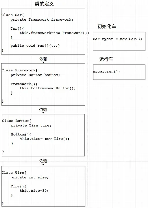 显然你也应该观察到了,因为采用了依赖注入,在初始化的过程中就不可避免的会写大量的new。这里IoC容器就解决了这个问题。这个容器可以自动对你的代码进行初始化,你只需要维护一个Configuration(可以是xml可以是一段代码),而不用每次初始化一辆车都要亲手去写那一大段初始化的代码。这是引入IoC Container的第一个好处。IoC Container的第二个好处是:我们在创建实例的时候不需要了解其中的细节。在上面的例子中,我们自己手动创建一个车instance时候,是从底层往上层new的: